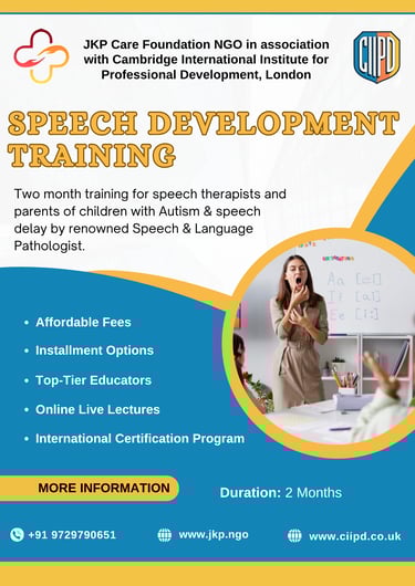 JKP Care Foundation is a registered non-governmental organization committed to empowering professionals and caregivers in the field of special needs education and therapy. We provide structured, ethical, and practice-oriented training programs for doctors, therapists, educators, and parents, with a focus on building inclusive and child-centric support systems.